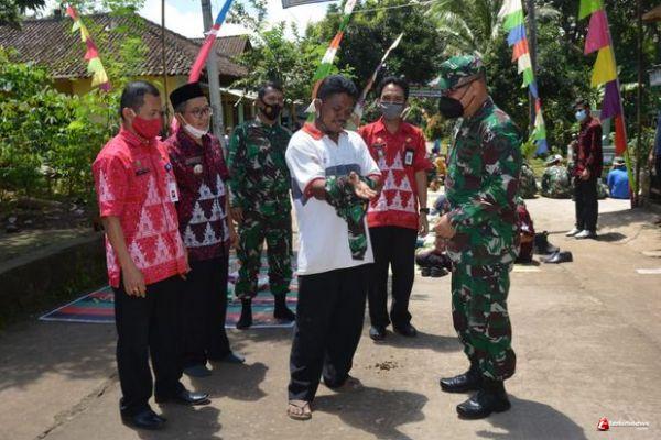 Penyerahan kaos loreng kepada Rustamaji disaksikan oleh Pasiter Kodim 0714/Salatiga, Kapten inf Sofyan Amirudin, Kepala Desa Ketapang dan juga perangkat Desa Ketapang. (*Pendim 0714/Salatiga).
