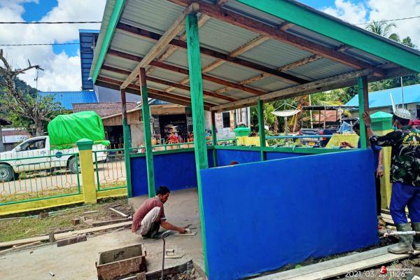 Pengkadan — Personil Satgas TMMD dengan di bantu warga terus mengerjakan tempat wudhu yang menjadi salah satu sasaran fisik di lokasi TMMD Dusun Suka Ramai, Desa Hulu Pengkadan, Kecamatan Pengkadan, Kabupaten Kapuas Hulu, Provinsi Kalimantan Barat Tahun 2021.