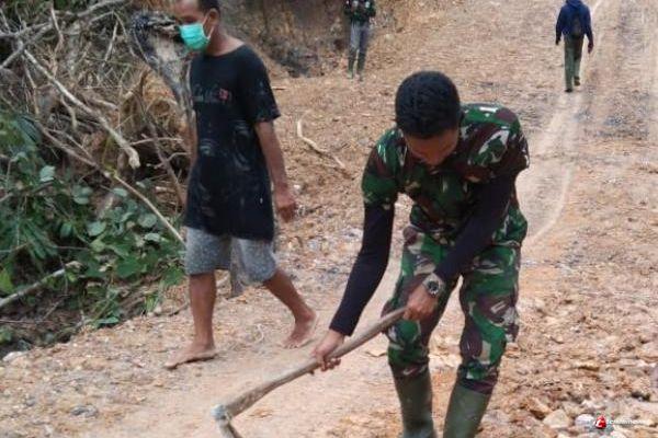 Pengkadan - anggota Satgas TMMD 110 di Desa Beringin mengajak warga bergotong royong melaksanakan penimbunan jalan yang terlihat berlubang di beberapa titik jalan di Dusun Tintin Kemantan, Desa hulu Pengkadan, Kecamatan Pengkadan , Kabupaten Kapuas hulu.