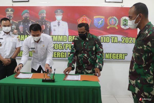 Kapuas Hulu - Bupati Kapuas Hulu Fransiskus Diaan S.H, menutup kegiatan TNI Manunggal Membangun Desa (TMMD) Regtas Ke 110 Kodim 1206/PSB yang dipusatkan di Dusun Tintin Kemantan, Desa Hulu Pengkadan, Kecamatan Pengkadan, Kabupaten Kapuas Hulu, Provinsi Kalimantan Barat. Penutupan ditandai dengan penyerahan naskah di Aula Makodim 1206/PSB. Rabu, (31/03/2021)