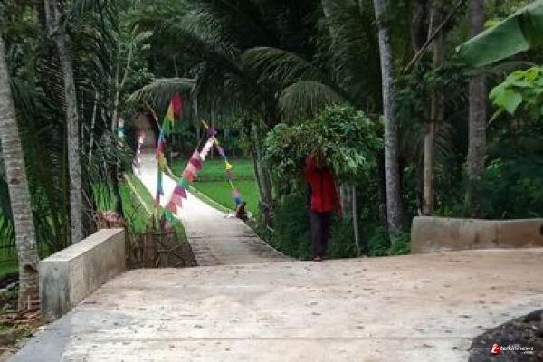 Darmin (53th) salah satu warga Dusun Sarimulyo,Desa Ketapang,saat pulang dari kebun dengan membawa pakan ternak dia mencoba jalan baru melewati hasil pembangunan jalan yang baru saja diresmikan.
