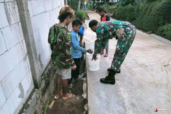 Sertu Ngadiman salah satu Tim Jurnalis dari Satgas TMMD berkunjung dan meyambangi warga desa ketapang,diperjalanan sepanjang jalan baru hasil TMMD Sertu Ngadiman melihat beberapa anak remaja yang sedang membersihkan saluran air sepanjang jalan baru.