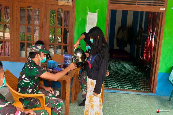 Satgas TMMD Ke 110 Kodim 1206/PSB yang akan pulang ke satuanya masing-masing meminta agar kopi yang ada di dalam termos dituangkan ke dalam cangkir. Dengan senang hati, remaja putri ini menuangkan kopi ke gelas yang sudah disodorkan kepada mereka.