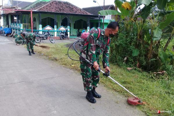 "Dihalaman Bilal Bin Rabah Kp.Tegal Asri RW 17 Kelurahan Banjarsari kecamatan Banjarsari Surakarta Anggota Koramil 02/Banjarsari bersinergis dengan Tamir masjid Ustad Daryanto Melaksanakan pembersihan di sekitaran Masjid denganr memotong rumbut yang tumbuh liar di Sela -Sela Kegiatan Karya Bhakti daerah."tutur Danramil saat ditemui disela-sela kegiatan.