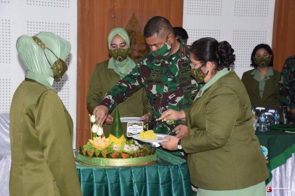 Syukuran HUT ke-75 Persit KCK di tandai dengan pemotongan tumpeng oleh Danrem 072/Pmk Brigjen TNI Ibnu Bintang Setiawan, S.I.P., M.M, beserta Ny Christine Bintang diberikan kepada Ny Haris Wibowo anggota persit yang menjadi tenaga Kesehatan dalam masa pandemi Covid-19.