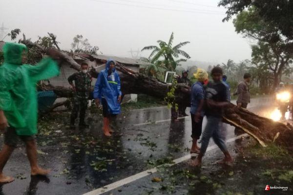 Hujan deras disertai angin kencang telah menyebabkan pohon jenis Mahoni disamping kiri Pom Bensin Mandirancan, tumbang melintasi jalan raya sehingga membuat kemacetan total, Minggu (11/4/2021)