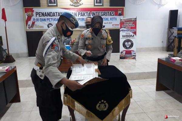 TEGAL - Polres Tegal Kota canangkan pembangunan zona integritas untuk mempertahankan Wilayah Bebas dari Korupsi (WBK) menuju Wilayah Birokrasi Bersih dan Melayani (WBBM), Senin (12/04/2021).