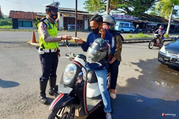 Operasi Keselamatan Lalu Lintas Candi 2021, Sat Lantas Polres Pekalongan kembali memberi imbauan tertib berlalu lintas sembari membagikan masker kepada masyarakat di Jl. Raya Sipait, Selasa (13/04/2021).