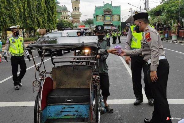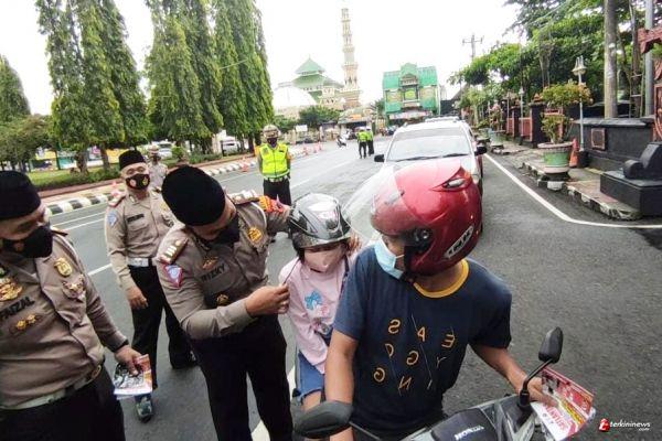 Menggunakan media wayang lalu lintas, polisi memberikan edukasi tertib berlalu lintas. Selain itu, membagikan helm, masker, face shield dan takjil untuk berbuka puasa bagi pengendara yang melintas.