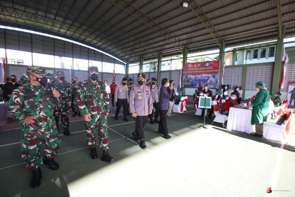 Panglima TNI Marsekal Hadi Tjahjanto dan Kapolri Jenderal Listyo Sigit Prabowo meninjau langsung pelaksanaan vaksinasi massal di Bali. Peninjauan itu dilakukan di GOR Kepaon Kodam Udayana dan Mall Bali Galeria, Rabu (21/4/2021).