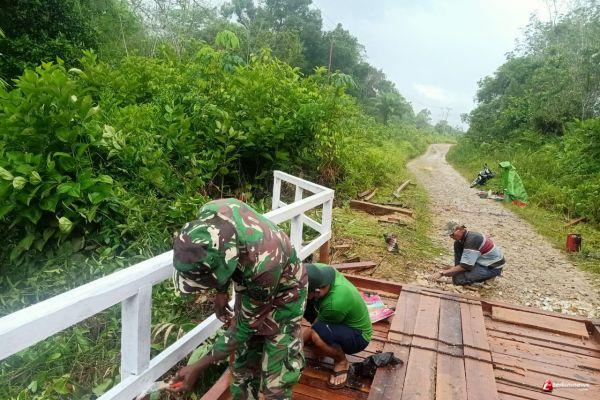 Personel Satgas Pamtas Yonif 407/PK, Pos Langau I bersama warga melaksanakan kegiatan karya bhakti merenovasi jembatan yang berada di Desa Langau, Kec. Puring Kencana, Kab. Kapuas Hulu, Kalbar, kemarin hari Senin (26/04/2021).