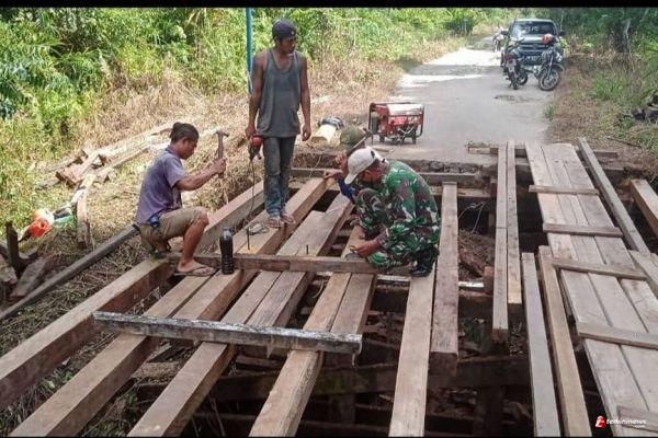Babinsa Koramil 1206-05/Embaloh Hulu Serda Sutomo bersama warga dusun pinjauan desa pulau manak bersama membuat jembatan darurat yang rusak akibat kendaraan berat bermuatan lebih melalui jembatan tersebut.