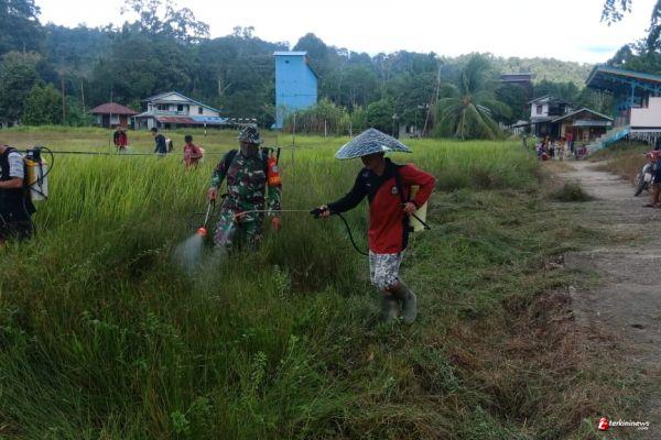 Tambah Babinsa menjelaskan, kegiatan kali ini kita fokuskan untuk membersihkan rumput yang sudah panjang di sekitar lapangan, dengan menggunakan mesin potong rumput dan sabit, serta penyemprotan racun rumput.