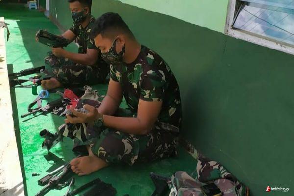 Usai apel pagi Anggota Koramil 1203-10/Sandai melaksanakan pembersihan senjata laras panjang (ss1v1) di Makoramil Jalan Pangeran Zaenudin Kecamatan Sandai Kabupaten Ketapang, Kamis (27/5/2021)