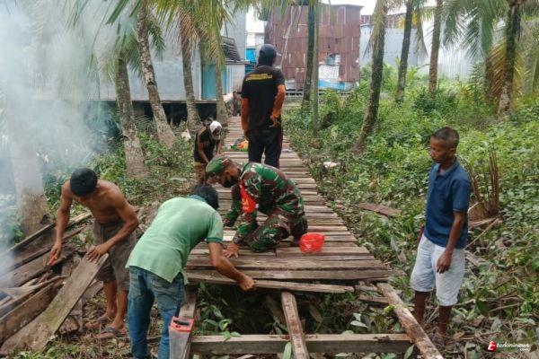 Gunakan Hari Libur, Babinsa Teluk Melano Kodim 1203/Ktp Ajak Warga Perbaiki Jalan Kampung.
