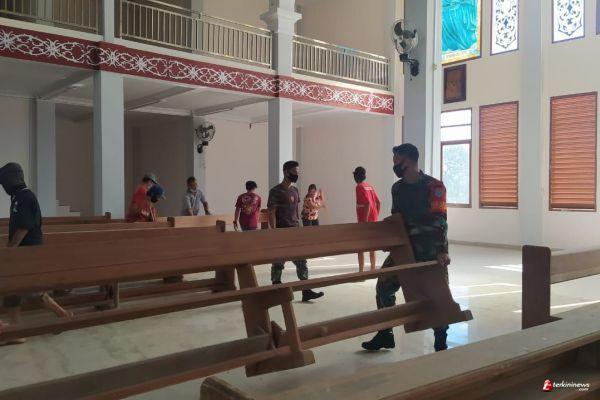Seberuang - Demi menjaga Kebersihan dan keindahan lingkungan Gereja, Koramil 1206- 16/Seberuang Serda Yohanes, melaksanakan gotong royong bersama masyarakat membersihkan lingkungan Gereja sejiram, Kecamatan Seberuang, Kabupaten Kapuas Hulu, Minggu (30/05/21).