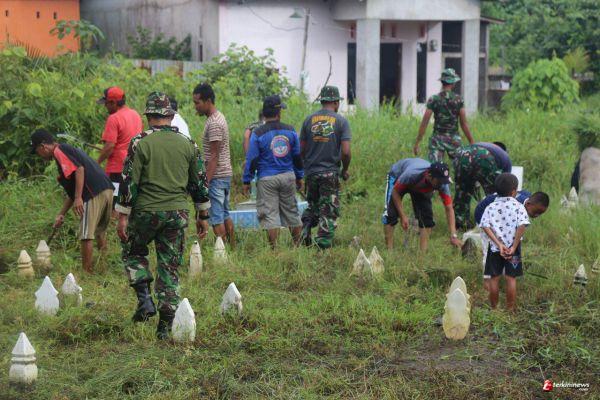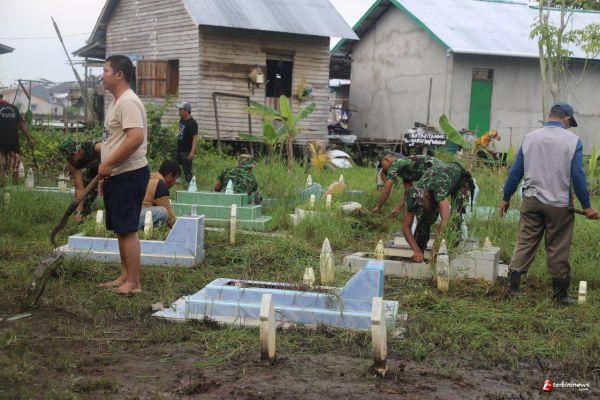 Prajurit Ajendam XII/Tanjungpura bersama warga desa banjar serasan menggelar karya bakti membersihkan makam umum di desa banjar serasan, Rabu 2/06/21).