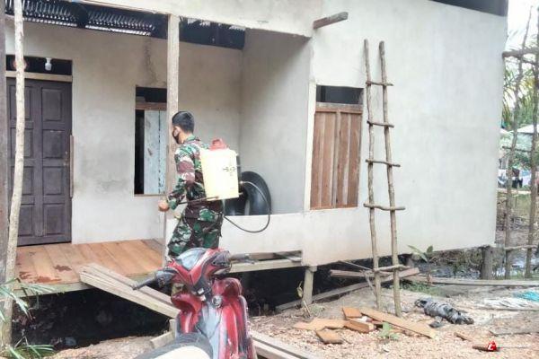 Silat Hilir - Putuskan Penyebaran Covid-19, Babinsa Koramil 16/Seberuang jajaran Kodim 1206/Putussibau Serda Bernadus terus melakukan penyemprotan disinfektan di ruang lingkup perumahan warga wilayah binaan, Desa Ranyai, Kecamatan Seberuang, Kabupaten Kapuas Hulu, Jumat (11/06/2021).