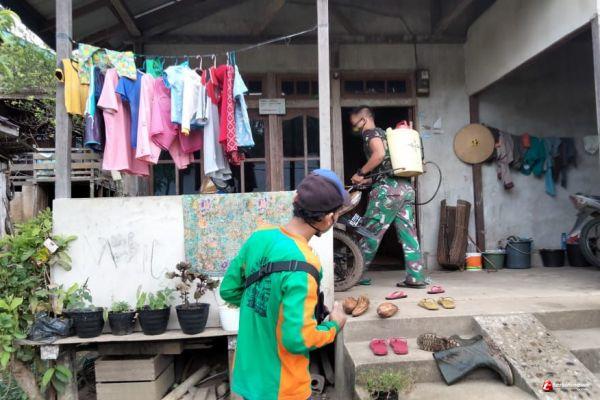Seberuang - Putuskan Penyebaran Covid-19, Babinsa Koramil 16/Seberuang jajaran Kodim 1206/Putussibau Serda Bernadus terus melakukan penyemprotan disinfektan di ruang lingkup perumahan warga wilayah binaan, Desa Ranyai, Kecamatan Seberuang, Kabupaten Kapuas Hulu, Minggu (13/06/2021).