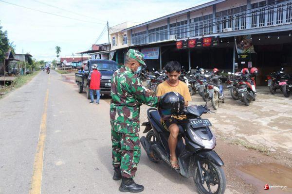 Pala Pulau - Babinsa koramil 1206-06/Putussibau Utara kodim 1206/Psb Serda Dakun bersama Bhabinkamtipmas Bripka Irwan Yarangga membagikan masker gratis kepada warga binaan sekaligus memberikan Sosialisasi pemahaman tentang masalah virus covid-19 (corona) kepada warga binaannya bertempat di kampung Pala Pulau, Kecamatan Putussibau selatan, Kabupaten Kapuas Hulu. Senin (14/06/21).