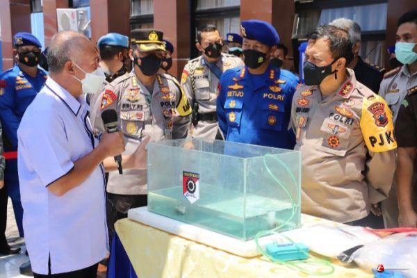 Kapolda Jateng Irjen Pol Ahmad Luthfi dengan didampingi Dirpolair Polda Jateng, Kombes Pol. R. Setijo Nugroho H.H.P., S.I.K., menyampaikan keberhasilan Ditpolair Polda Jateng dalam Mengungkap penyelundupan Benih Bening Lobster, diwilayah Hukum Polda Jateng, di Halaman Kantor Ditpolair Polda Jateng, Rabu (29/9/21).