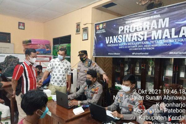 Polres Kendal menggelar vaksinasi malam hari di Aula Balaidesa Kebonharjo Kecamatan Patebon Kendal, Sabtu malam (2/10/2021).