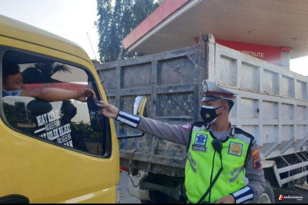 Satlantas Polres Kendal melaksanakan edukasi protokol kesehatan (prokes) dengan membagikan masker kepada masyarakat yang beraktifitas di Seputaran SPBU Jambearum Kecamatan Patebon Kabupaten Kendal, Rabu (6/10/2021).