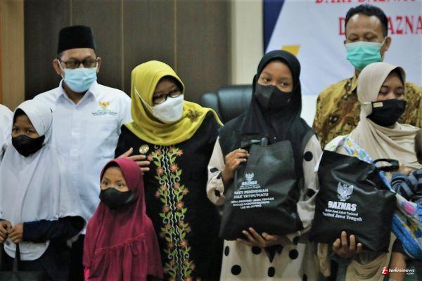 TEGAL – Selama hampir 20 bulan musibah pandemi Covid-19, sebanyak 427 anak di Kabupaten Tegal kehilangan orang tua, baik ayah, ibu ataupun keduanya. Untuk membantu meringankan beban anak, Badan Amil Zakat Nasional (Baznas) Kabupaten Tegal dan Provinsi Jawa Tengah salurkan 206 paket berisi peralatan tulis, suplemen makanan, jajanan anak hingga perlengkapan mandi kepada perwakilan anak yatim di ruang rapat Bupati Tegal, Senin (18/10/2021) pagi.