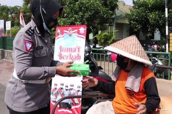 Peduli sesama, Polwan Sat Lantas Polres Pekalongan Kota berikan nasi bungkus dan masker gtatis kepada masyarakat yang terdampak PPKM dimasa pandemi Covid-19 di wilayah Kota Pekalongan, Jum'at (22/10/21).