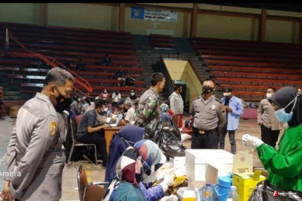 Kapolsekta Kendal IPTU Samsul Hadi SH bersama anggota meninjau pelaksanaan vaksinasi Handal Polres Kendal yang menjadi lokasi vaksinasi yang digelar malam hari, yakni di Gor Bahurekso Kendal yang dimulai dari pukul 18.00 - 21.00 Wib.