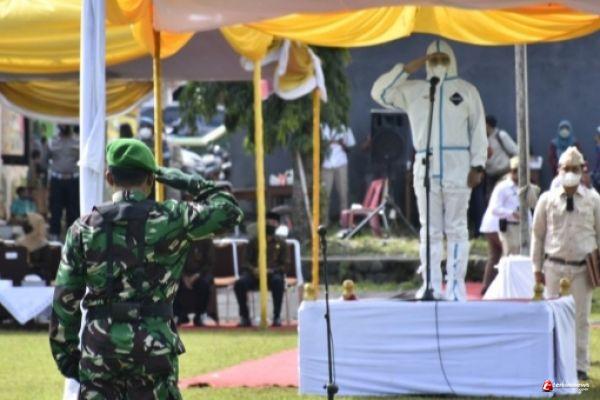 Sebagai Inspektur Upacara Bupati Kendal Dico M. Ganinduto mengenakan pakain APD Hazmat lengkap yang menggambarkan bahwa selama masa pandemi tenaga kesehatan merupakan pahlawan yang telah memerangi pandemi covid-19.