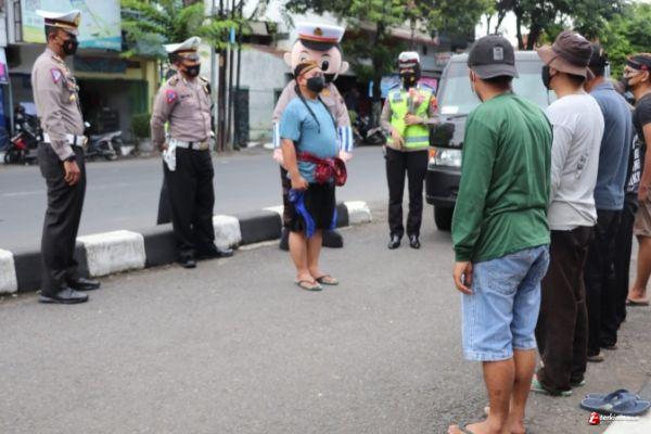 Tidak ada denda atau tilang bagi pelanggar lalu lintas dan prokes ini. Petugas meminta pelanggar mengenakan pakaian badut polisi dan ikut memberikan imbauan kepada pengguna jalan.