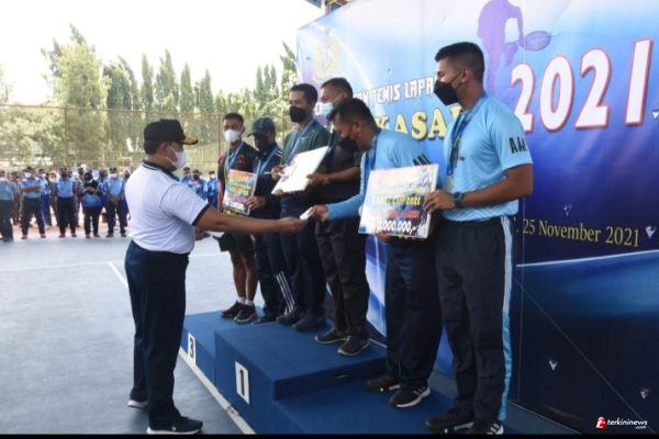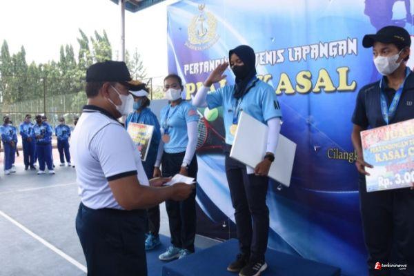 Kepala Departemen Teknik (Kadeptek) AAL, Kolonel Laut (T) Hamzah, S.E., M.Tr.Hanla, M.M. selaku Pembina Yanus Tenis AAL, mewakili Gubernur AAL, Mayjend TNI (Mar) Nur Alamsyah, S.E., M.M., M.Tr (Han) menerima Piala Juara Umum yang diserahkan Kasal.