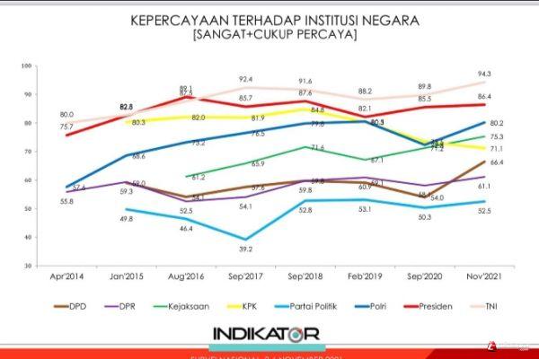 Berikut grafik survei kepercayaan masyarakat terhadap Polri dari tahun 2014 hingga 2021 berdasarkan data Indikator Politik Indonesia. Tahun 2014 sebesar 57,5 persen, 2015 sebesar 68,6 persen, 2016 sebesar 73,2 persen, 2017 sebesar 76,5 persen, 2018 sebesar 79,8 persen, 2019 sebesar 80 persen, 2020 sebesar 72% dan di tahun 2021 80,2%.