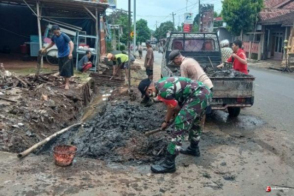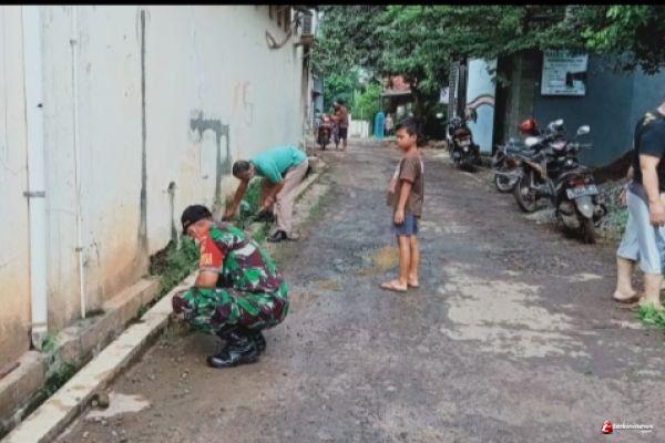 Antisipasi Banjir, Babinsa Gotong Royong Bersihkan Selokan