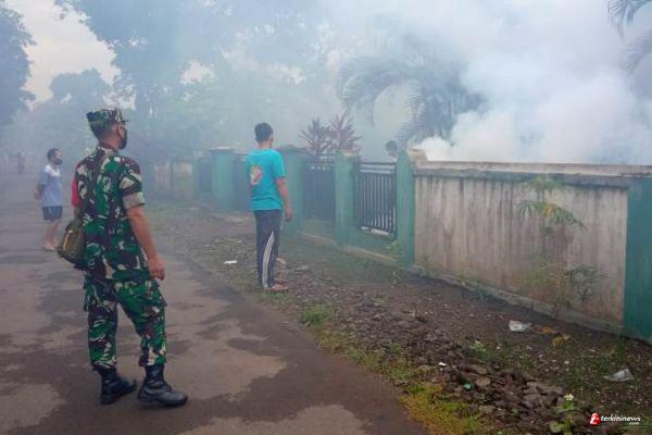 Cilacap - Berantas nyamuk Aedes Aegypti, Babinsa Koramil 08/Adipala Pelda Mashud Suminto, dampingi kegiatan penyemprotan/fogging yang dilakukan petugas kesehatan dari Dinas Kesehatan Kabupaten Cilacap, di Dusun Adipala Wetan dan Dusun Ciwiru, Desa Adipala, Kecamatan Adipala, Selasa (15/2/22).