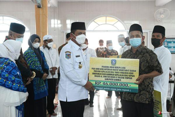 KARIMUN- Gubernur Kepulauan Riau H. Ansar Ahmad dalam kunjungan kerjanya ke Kabupaten Karimun menyempatkan secara khusus untuk menyerahkan dana hibah untuk rumah ibadah sekaligus memperingati Isra Miraj di mesjid Al Falah, Tanjung Balai, Karimun, Kamis (10/3/2022).