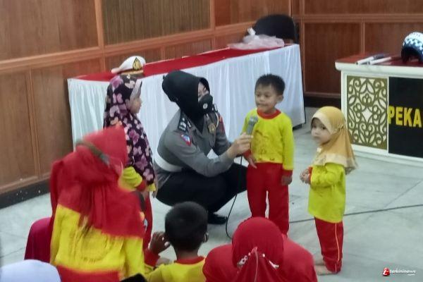 Markas Komando eks Wil Pekalongan Lalu lintas Polres Pekalongan Kota Polda Jawa Tengah diserbu puluhan anak TK KB Amanu Klego Kecamatan Pekalongan Timur, Kamis, (18/03/2022).