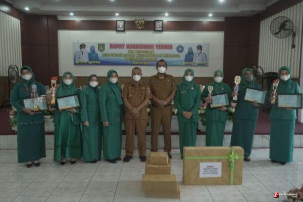 Asisten Pemerintahan dan Kesejahteraan Rakyat menyerahkan hadiah kepada pemenang di 5 katagori Hari Kesatuan Gerak (HKG) PKK Tingkat Provinsi Sumatera Utara