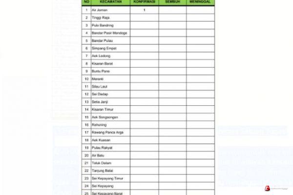 ASAHAN - Rekapitulasi Harian Covid – 19 per Kecamatan untuk hari ini sebagaimana data surveilans dari seluruh Puskesmas di wilayah Kabupaten Asahan yang di kelola Dinas Kesehatan ada 1 orang yang Terkonfirmasi Positif, tidak ada orang Sembuh dan tidak ada orang yang meninggal dunia akibat Covid – 19.