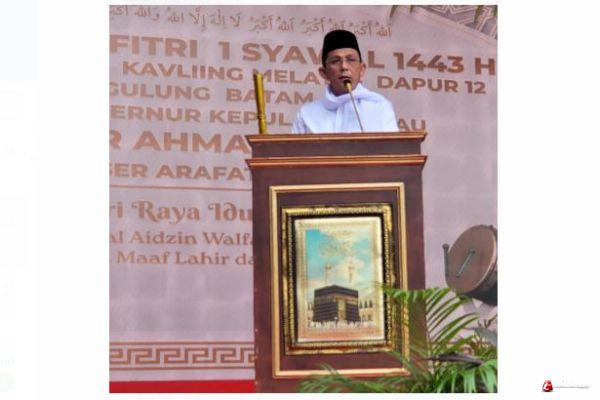 DISKOMINFO KEPRI - Gubernur Kepulauan Riau H. Ansar Ahmad menjadi khatib sholat 'Iedul Fitri 1443 hijriyah di masjid An-Nur, Kavling Melati Dapur 12, Sagulung, kota Batam, Senin (2/5).