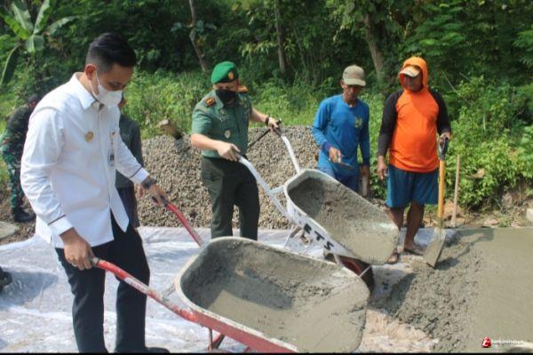 Selesai penyerahan naskah berita acara, Letkol Inf Jenry Polii bersama Bupati dan jajaran Forkompimda turut meninjau langsung pelaksanaan pengecoran jalan di dusun Bojengan Desa Sambungsari.