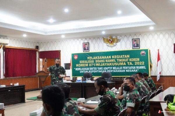 Guna untuk mewujudkan Pembinaan Teritorial (Binter) yang adaptif dalam rangka menyiapkan Wanwil untuk kepentingan negara diwilayah, Korem 071/Wijayakusuma menggelar Sosialisasi Bidang Wanwil Tahun 2022, Selasa (24/5/2022) di Aula Jenderal Sudirman Makorem 071/Wijayakusuma, Sokaraja, Banyumas.