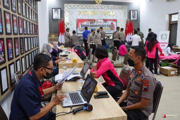 TEGAL – Dalam rangka memperingati Hari Ulang Tahun (HUT) ke 76 Bhayangkara, Polres Tegal bersama PMI Kabupaten Tegal menggelar kegiatan donor darah di Gedung SSB Mapolres Tegal, Selasa 7 Juni 2022.