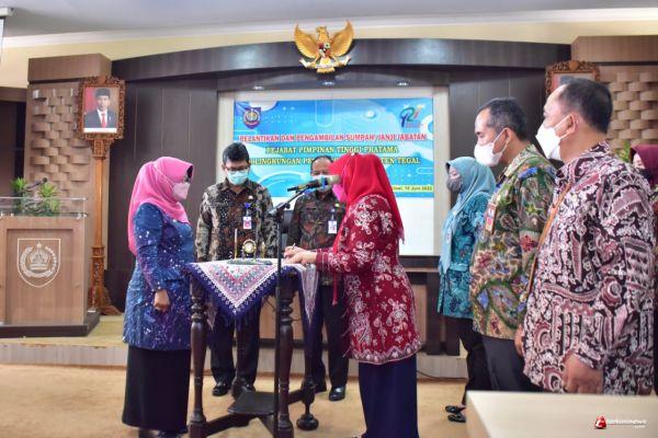 TEGAL -Bupati Tegal, Umi Azizah mengambil sumpah jabatan dan melantik sembilan pejabat Pimpinan Tinggi Pratama di lingkungan Pemkab Tegal, Jumat (10/6/2022) pagi, di Ruang Rapat Bupati Tegal.