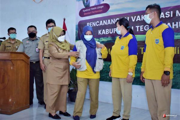 TEGAL – Pemerintah Kabupaten Tegal menerima bantuan perdana 1.500 dosis vaksin penyakit mulut dan kuku (PMK) dari Kementerian Pertanian (Kementan) RI. Penyerahan vaksin ini dilakukan oleh Kepala Balai Veteriner Subang Kementan RI Sodirun kepada Bupati Tegal Umi Azizah di Gedung Serbaguna Desa Jatilaba, Kecamatan Margasari, Senin (04/07/2022) siang.