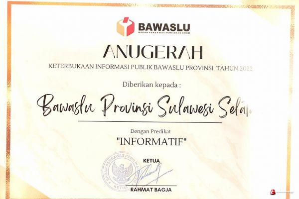 JAKARTA, -- Badan Pengawas Pemilihan Umum (Bawaslu) Provinsi Sulawesi Selatan meraih gelar Badan Publik Informatif pada penganugerahan keterbukaan informasi publik Bawaslu Provinsi Tahun 2022 terkininews.com