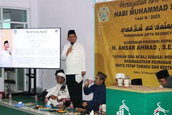 BATAM - Gubernur Kepulauan Riau H. Ansar Ahmad menghadiri Peringatan Isra' Miraj Nabi Besar Muhammad SAW 1444 H 2023 M di Masjid As-Salam Perum Cipta Regency, Batam, Sabtu (18/02) malam.