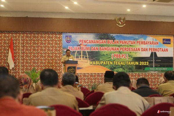 TEGAL – Pelaksana Harian (Plh) Sekretaris Daerah Kabupaten Tegal Dadang Darusman meminta pemerintah desa terus memantau proses pembayaran pajak bumi dan bangunan perkotaan dan perdesaan (PBB-P2). Hal ini ditegaskannya dalam acara Pancanangan Bulan Panutan Pembayaran PBB-P2 di Hall Room Hotel Grand Dian Slawi, Senin (26/06/2023).
