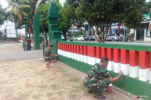 BREBES – Jelang peringatan HUT ke-78 Kemerdekaan Republik Indonesia, anggota Koramil 08 Bumiayu Kodim 0713 Brebes, memerah-putihkan pangkalan. Rabu (9/8/2023).